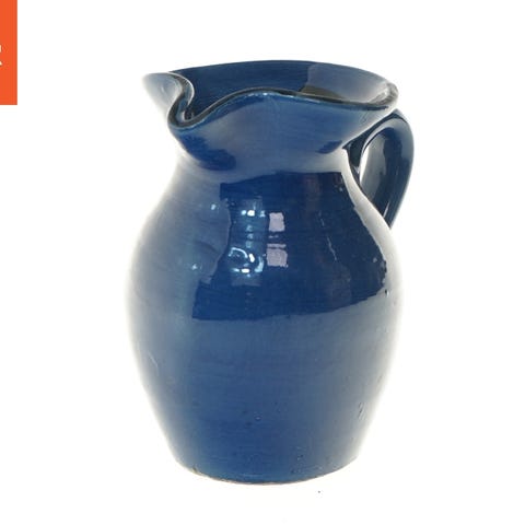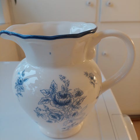 Dette er en keramisk kande med et unikt blåt blomsterdesign. Kanden har en højde på 16,5 cm og en diameter på 9,5 cm ved basen. Den er hvid med håndmalede blå blomster og detaljer, der giver den et kunstnerisk og traditionelt udseende. Den har en bred åbning og en smal tud for nem hældning. Bunden viser tegn på alder og brug, med en patina der indikerer tidligere anvendelse.