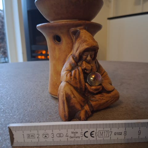Denne keramiske aromalys lampe består af to dele: en bassinformet top og en base med åbninger til lyset nedenunder. Den har et unikt design med dråbeformede huller og en blå glasur, der giver en dekorativ effekt. Den måler ca. 11 cm i højden og er ideel til brug med duftolier eller voks til aromaterapi.