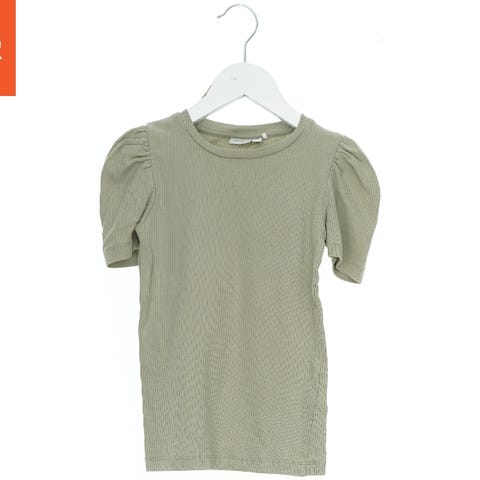 En kortærmet T-shirt i en grøn farve. T-shirten har to træknapper ved halsudskæringen, som er rund. Den er ribbet i strukturen og lavet af et blødt materiale.
