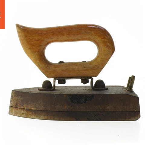Billederne viser et antikt strygejern fremstillet af metal og træ. Det har en messing-finish, hvilket giver det et gammeldags udseende. Strygejernet har håndtaget lavet af træ, der sidder på metalstænger, som forbinder til den tunge metaldel. Den nederste del af jernet er dekoreret med fine mønstre. Der er tydelige tegn på brug og slid på metallet.