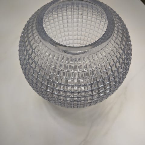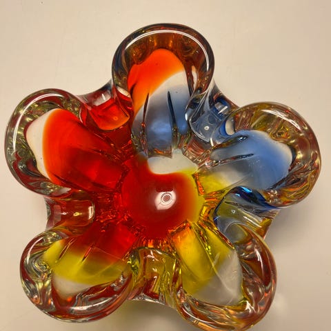 Farverig Yvolux trekantet glasvase med et abstrakt mønster. En dekorativ Murano glasvase med et levende mønster af gule, blå og sorte farver. Vasens mønster er unikt med maleriske linjer og pletter, der tilføjer et kunstnerisk udtryk til den sfæriske form. Den har en højde på ca. 20 cm og er ideel til at indrette hjemmet med blomster eller som et selvstændigt kunstobjekt.