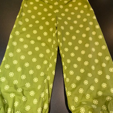 Bukserne er blomstermønstrede med en beige base. Designet inkluderer forskellige blomster i nuancer af brun, hvid og grøn. Bukserne har en elastik i taljen og er beregnet til børn.
