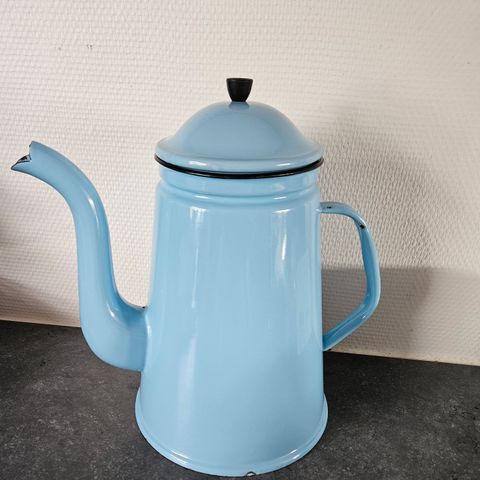 Emalje, MADAME BLÅ, Stor RETRO kaffekande, Madame blå, i den originale lyseblå farve. Fra ikke ryger hjem. Pæn stand, dog med aldersrelateret brugsspor i form af 2 små afslag. ( se billeder )