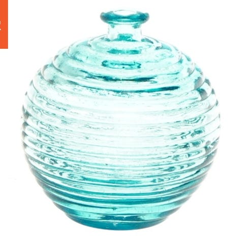 Den viste genstand er en runde glasvase med en blød blålig tone. Den har en bred form med en smal åbning øverst, hvilket er ideelt til dekorative formål. Størrelsen på vasen er 18,5 cm i højden. Vasen kan anvendes som dekoration eller til at holde blomster og grene.