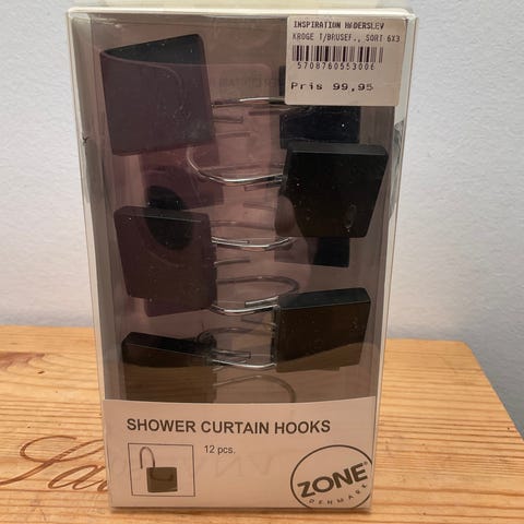 Dette produkt er en pakke med 12 bruseforhængskroge. Krogene er firkantede og blå i farven, designet til at hænge bruseforhænget sikkert op. Pakken viser tydeligt mærket Zone Denmark, som er kendt for kvalitetsprodukter til hjemmet. Produktet er pakket i en gennemsigtig plastemballage med både forsiden og bagsiden synlig.