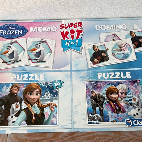Dette er et Clementoni Frozen Super Kit 4-i-1, der indeholder forskellige typer spil. Sættet inkluderer memo, domino og to puslespil med 30 brikker hver. Det er designet til børn fra 4 år og op, med motiver fra den populære Frozen film. Æsken har en størrelse på 6x28x42 cm.