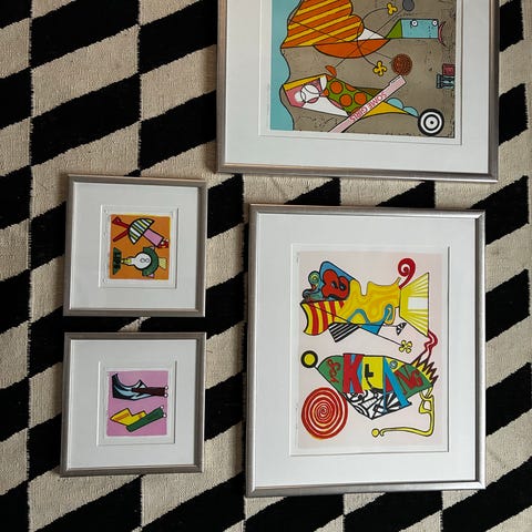 Abstrakt kunsttryk af Caroline Sillesen, med blå og orange motiver, sælges uden ramme. Signeret og nummereret 23/100.