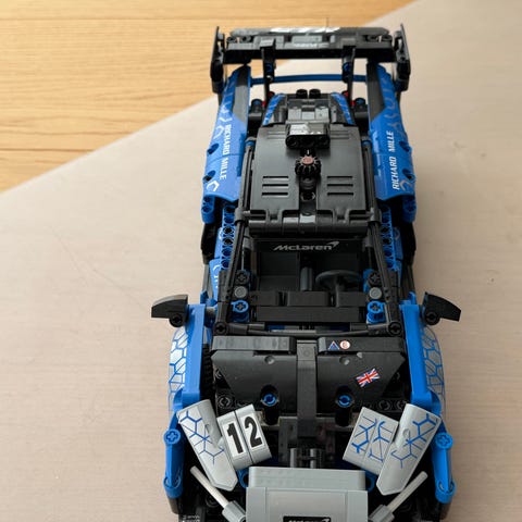 LEGO Speed Champions bil model i hvid farve. Bygget i LEGO-klodser med detaljer som spoiler og sorte vinduer. Egnet som samlerobjekt eller legetøj.