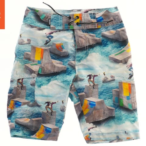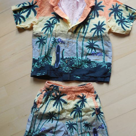 Børne shorts i grå med et bladlignende mønster. Shortsene har en elastisk linning med en snor til justering. Der er en baglomme med en lille mørk stjernedetalje.