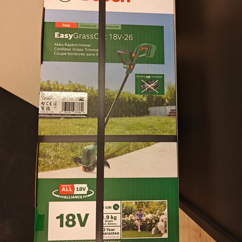 Bosch EasyGrassCut 18-230 trimmer med 18V batteri og 2.0 Ah kapacitet. Trimmeren er designet til præcis græsklipning og har justerbar skaftlængde for bedre ergonomi.
