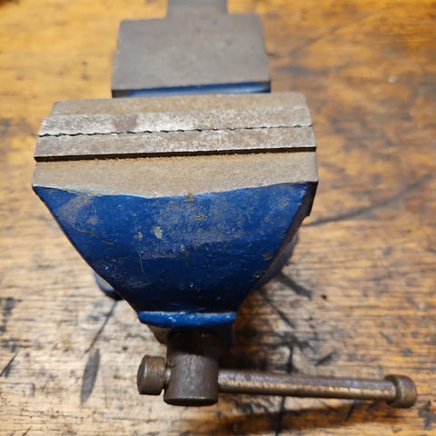 1 stk Skruestik med drejefunktion, blå farve, kæbestørrelse 10 cm. Fremstillet i metal. Velegnet til fastspænding af emner under arbejde.