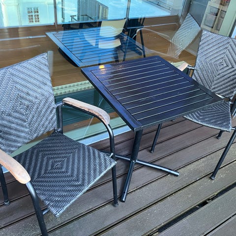 IKEA Terje balkonsæt bestående af et foldbart bord og to stole i træ med metalstel. Bordet måler 55x54 cm og har en højde på 67 cm. Stolene kan foldes sammen til opbevaring og transport. Sættet er designet til brug på balkoner og udendørsarealer.