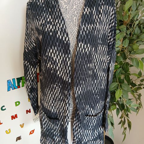 Elegant Cha Cha kimono i sort og gråt mønster. Jakken har en åben front og lange ærmer. Perfekt til at tilføje et stilfuldt lag til ethvert outfit har lommer i siderne
