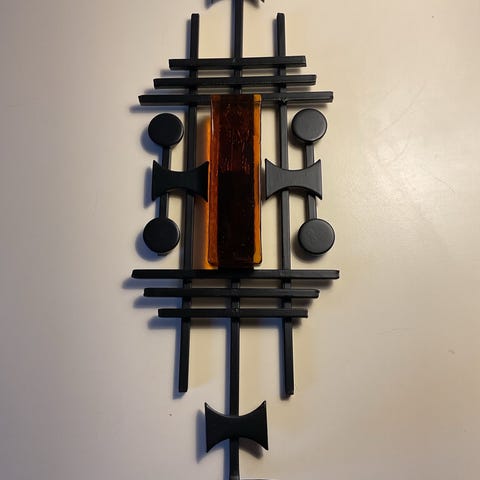 Smedejern relief væg lysestage Dantoft Kunstartikler med ravfarvet glas hjerte.