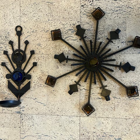 Sort smedejern væg lysestage med ravfarvet glas hjerte Dantoft Kunstartikler Danish Design, Svend Aage Holm Sørensen, retro fra 1960’erne sælges.