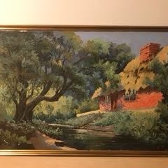 Maleri, olie på lærred, med motiv af landlige bygninger og høns. Maleriet er indrammet i en brunlig guldramme. Der minimale skader på maleriets overflade og ramme.