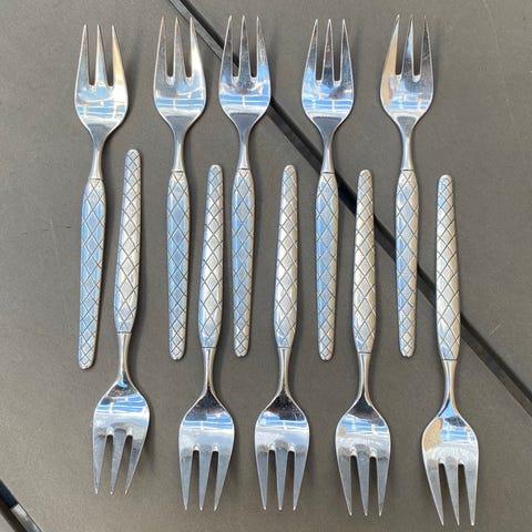 12 gamle kagegafler med et dekorativt og smukt mønster. Fremstillet i sølvplet. Alle gafler i flot stand. Længde 13,5 cm.