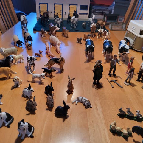 Schleich hestetrailer legetøj med detaljeret interiør, herunder siddepladser og bord, samt udendørs staldområde. Indeholder figurer af heste og personer, egnet til rollespil og samling.