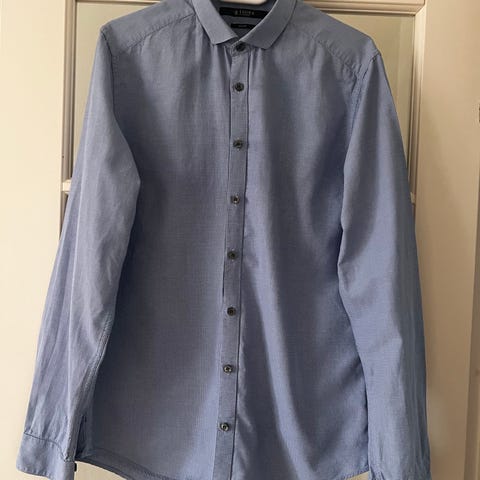 Tiger of Sweden Forward skjorte i størrelse L, farven blå med hvide striber. Fremstillet i bomuld. Skjorten har en rund krave og knaplukning. Købt I magasin for 1400. Sælges da jeg ikke kan passe den.