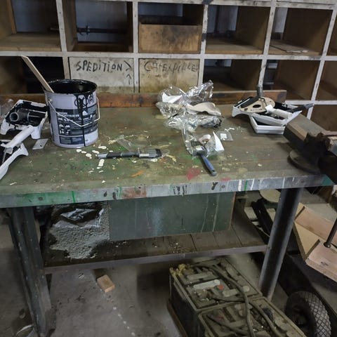 Ai tekst med fastmonteret skruestik. Bordet er lavet af metal med en træbordplade. robust konstruktion, velegnet til værkstedsbrug.