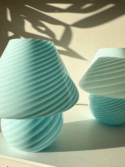 Mundblæst vintage Murano vase med swirl og blå farveafslutning i kanten. Har en rigtig god form til en lille markbuket, men er også utrolig sød på hylden som den er.