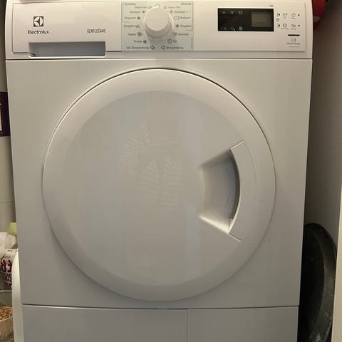 Electrolux Kondens tørretumbler med flere tørreprogrammer, Tørretumbleren er hvid og har en frontbetjent dør med digitalt display og drejeknap til valg af program. Den fungerer ved kondensation og er egnet til almindeligt husholdningsbrug.