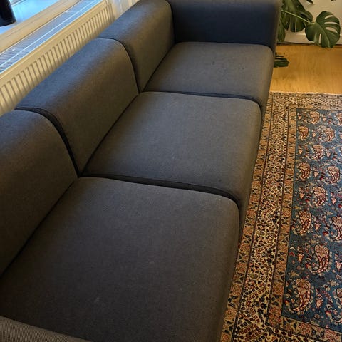 Hay sofa med chaiselong (venstre side når man står foran sofaen og kigger på den). Sofaen er brugt og med enkelte små pletter. Se fotos. Vil blive flot hvis renset. Lille hul bag på sofaen. Se foto. Giv et bud!