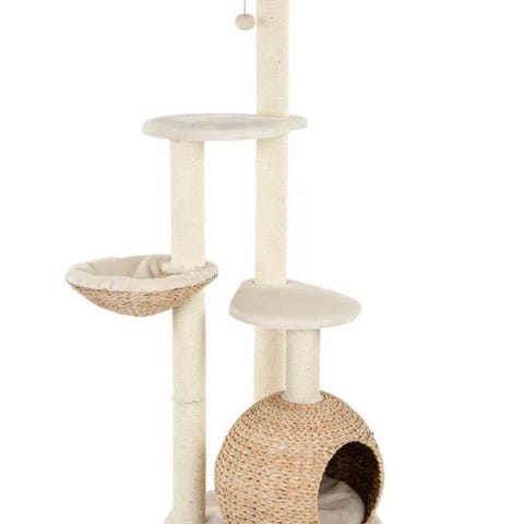 Stabil kradsesøjle med ekstra tyk stamme, omviklet med naturligt sisal-tæppe, bæredygtige platforme af ægte træ med aftagelig, vaskbar hyggeseng, højde ca. 94 cm Et fantastisk tårn/kradsetræ næsten ubrugt. Fejlkøb.