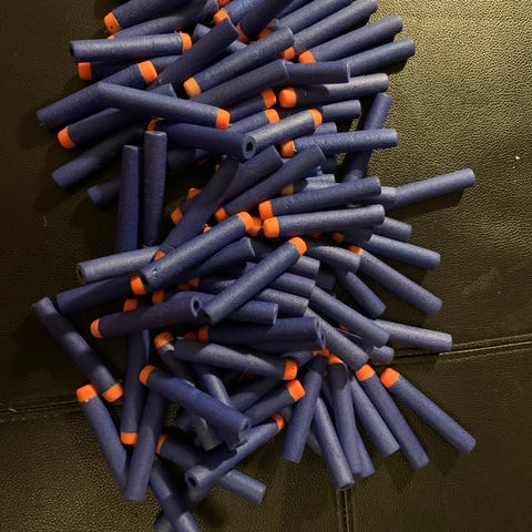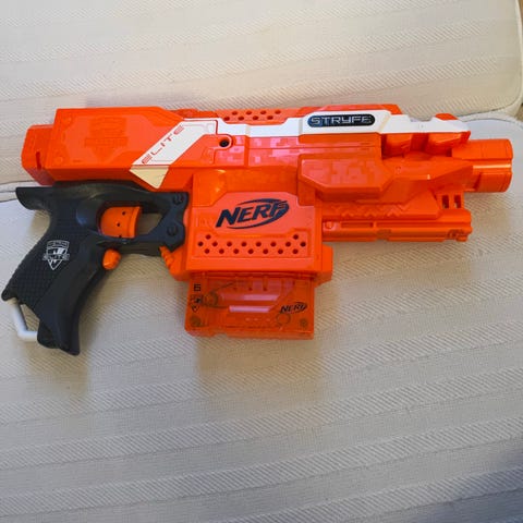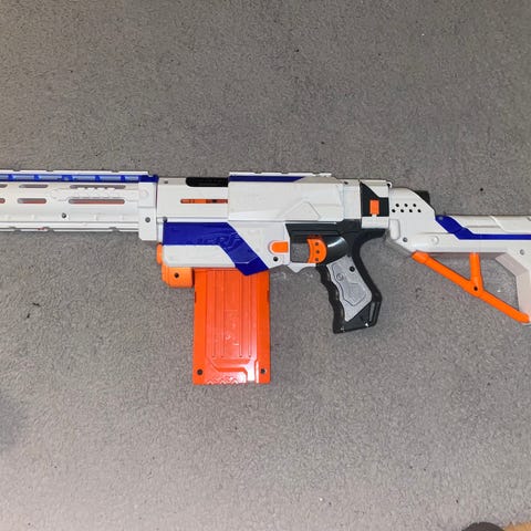Tre hjemmelavede Nerf gevær til salg og to pistoler samt et originalt gevær NERF