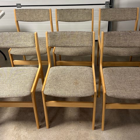 4 stole med nyt betræk. Er slebet og olieret. 3 i super fin stand, en der vipper lidt men kun når man ikke sidder i den.