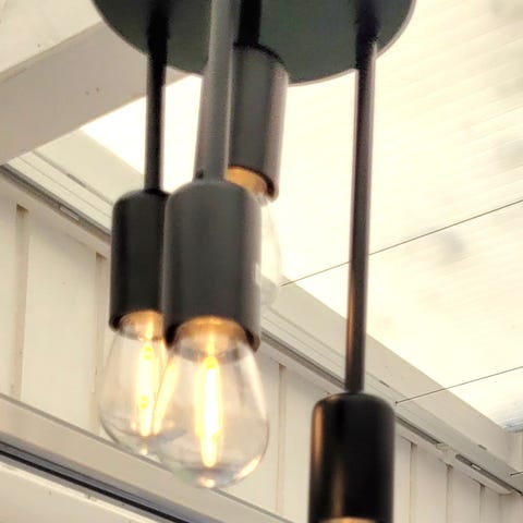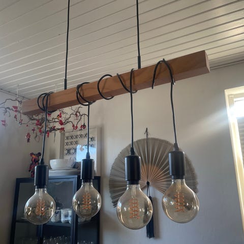 Rund loftlampe lavet af jern med små huller. Diameter cirka 50cm.