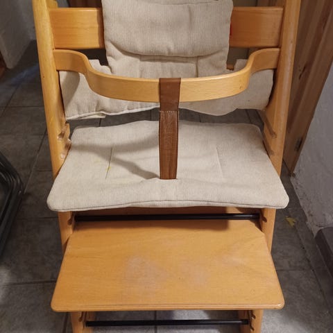 Trip trap højstol i træ. Højstolen er designet til børn og har en justerbar sidde- og fodplade for tilpasning til barnets vækst. Fremstillet i træ med en naturlig finish.