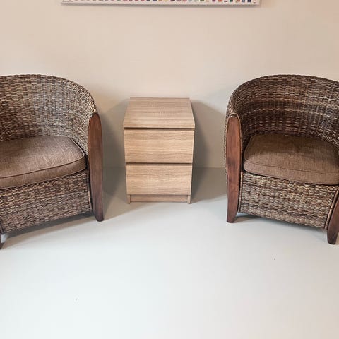 Sæt med to stole med hynde og lavt bord til altan eller have