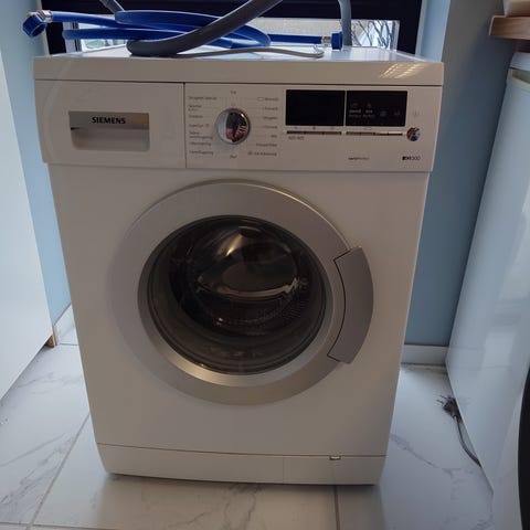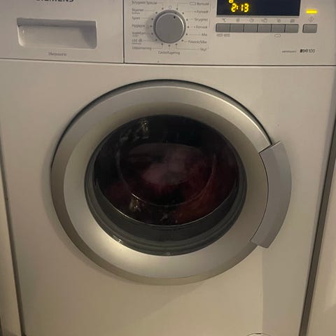 Siemens Frontbetjent vaskemaskine. Vaskemaskinen er udformet med frontbetjening og har et hvidt kabinet. Den er egnet til almindelig tøjvask.