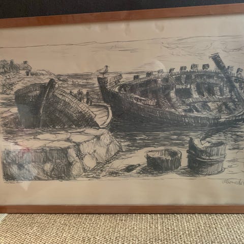Maleri af skib og mennesker i båd