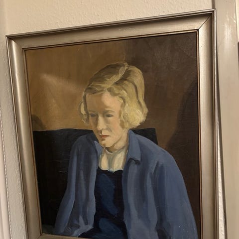 Dette stemningsfulde oliemaleri skildrer den romanske kirke Sainte-Foy i den sydfranske bjergby Mirmande. Med varme jordfarver, blødt lys og en rolig, terrasseret komposition formidler Løfgren landskabets stille poesi frem for topografisk nøjagtighed. De karakteristiske cypresser og de kompakte huse, der klatrer op mod kirken, forankrer motivet tydeligt i Provence/Drôme-området.