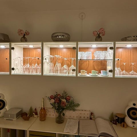 Vitrine med hylde og glas i siderne