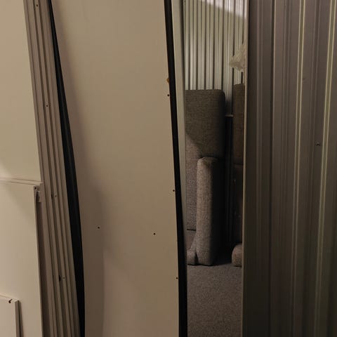 De er af modellen vilhatten, men det ene skab er blevet tilpasset/customized med massive hylder i stedet for en garderobestang. Disse er boret og skruet ind i skabet, så skruerne kan ses på ydersiden af skabet.