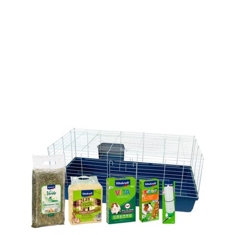 Der medfølger høhæk, drikkeflaske, to madskåle, to huse inkl. køjer, to putteposer samt en rummelig transportkasse med tæppe.