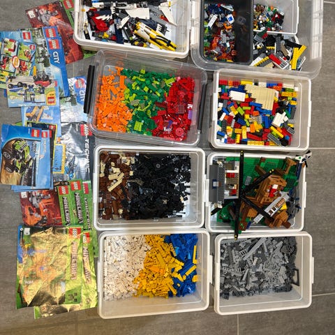 LEGO City byggeklodser med flere sæt og tilhørende instruktioner. Indeholder forskellige klodser i flere farver og størrelser, velegnet til konstruktion og leg. Sættet inkluderer både løse klodser og manualer til samling af specifikke modeller. Samlingen er på 17 kg plus samlehafter.