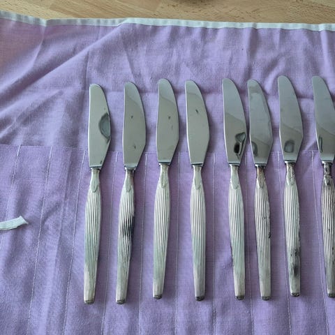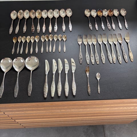 Sølvplet bestik. 14 Frokost gafler - 11 Kage gafler - 11 Middags gafler - 12 Suppe skeer - 12 Dessert skeer - 9 The Skeer - 10 Knive med ben skaft.