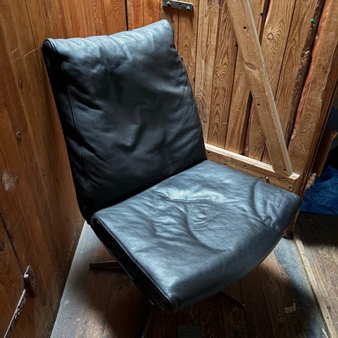 Sælger en Spencer lænestol fra ILVA i cognacfarvet kunstlæder med stel i stål. Stolen har et tidløst og elegant udtryk og er både komfortabel og solid.