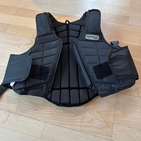 Equipage Sailor ridevest i størrelse SX i sort farve. Ridevesten er designet til beskyttelse under ridning og har lynlås foran. Materialet er fleksibelt og har meshpaneler for ventilation.