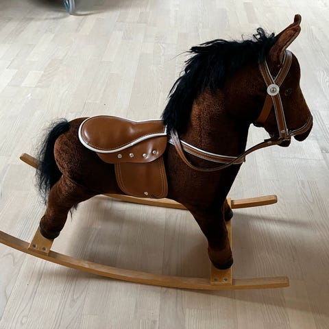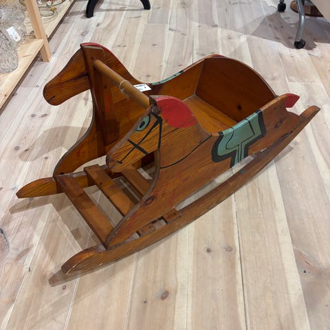 Retro gyngehest i træ med ryglæn, så barnet ikke falder bagover. Mærket Troja. Passer børn op til ca 2 år. Pæn stand