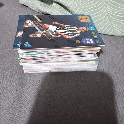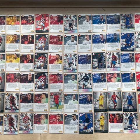 Panini fodboldkort samling bestående af kort med forskellige fodboldspillere og klublogoer. Kortene inkluderer diverse hold og spillere, og kan anvendes til samling eller spil.