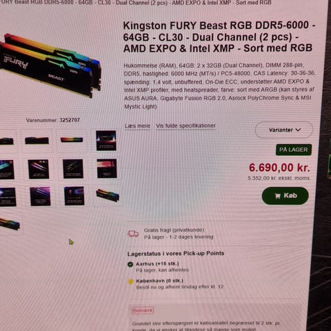 Hukommelse (RAM), 16GB: 2 x 8GB (Dual Channel), DIMM 288-pin, DDR5, hastighed: 5200 MHz (MT/s) / PC5-41600, CAS Latency: 36-38-38, spænding: 1.25 volt, ikke bufferet, On-Die ECC, understøtter AMD EXPO & Intel XMP profiler, med køleprofiler, farve: sort med ARGB (kan styres af ASUS AURA, Gigabyte Fusion RGB 2.0, Asrock PolyChrome Sync & MSI Mystic Light)