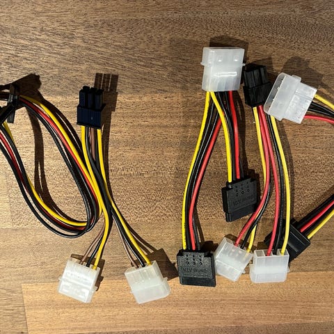 SATA kabler og et enkelt strømkabel til PCIe eller CPU.