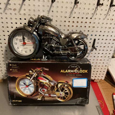 Kreativt motorcykel-vækkeur i retrostil, hvor uret er integreret i forhjulet. Mange flotte detaljer. Er velegnet til brug som bordur eller dekorativt pynt.