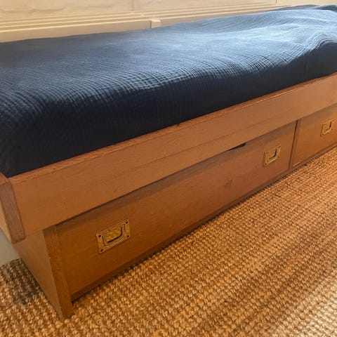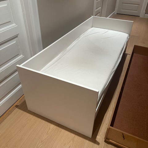 Skibsbriks, som kan omdannes til en dobbeltseng (140 x 190) med 2 gode skuffer til opbevaring af fx sengetøj.