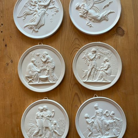 Royal Copenhagen samlerplatter, 8 stk., hver med forskellige motiver af klassiske malerier. Platterne er designet til at kunne hænges op, velegnede til dekorativ brug. Sælges samlet for kr. 1600 eller enkelvis for kr. 300